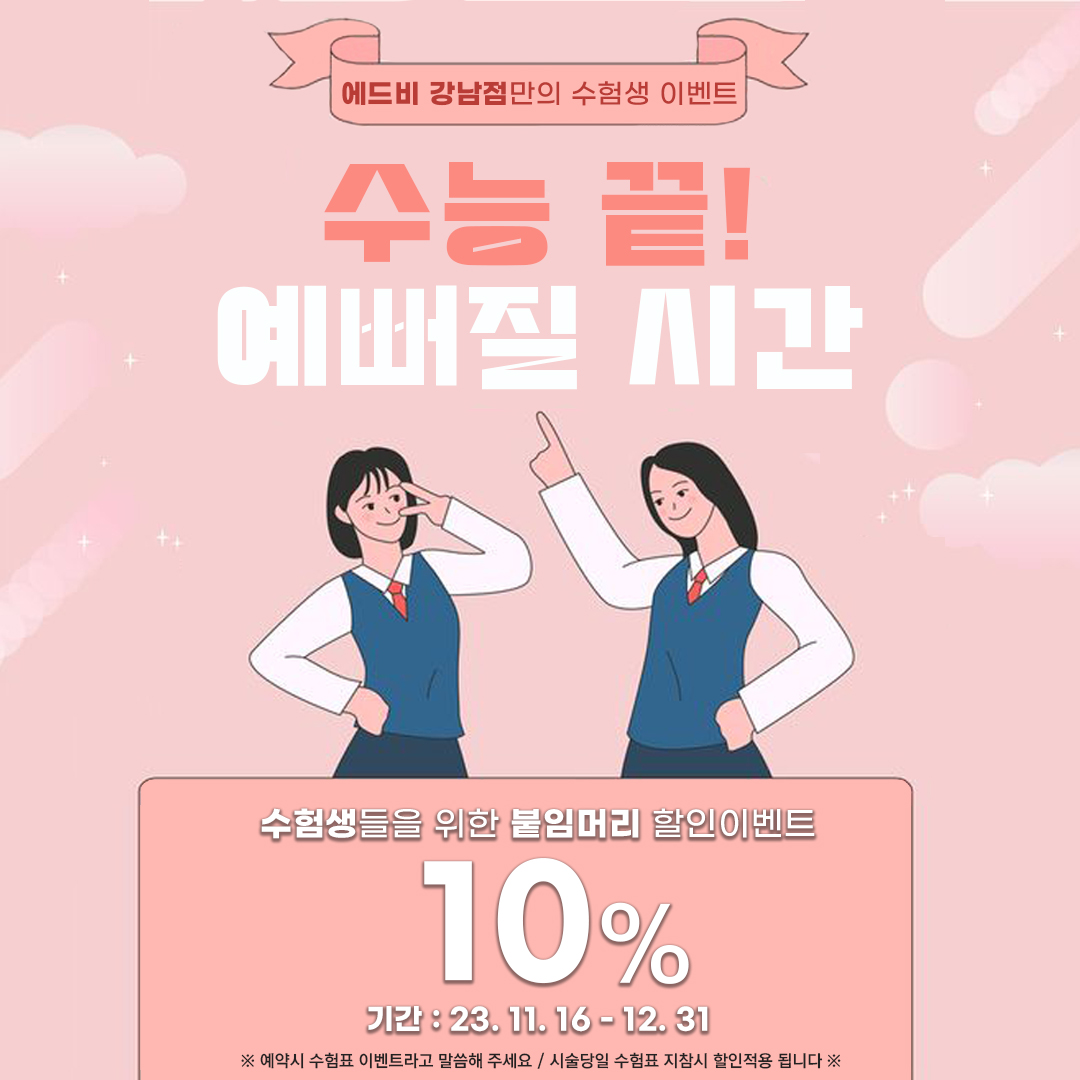 | 수능생할인미용실 수험표만 들고오면 붙임머리 할인이벤트 (0) | 2023.11.15 |